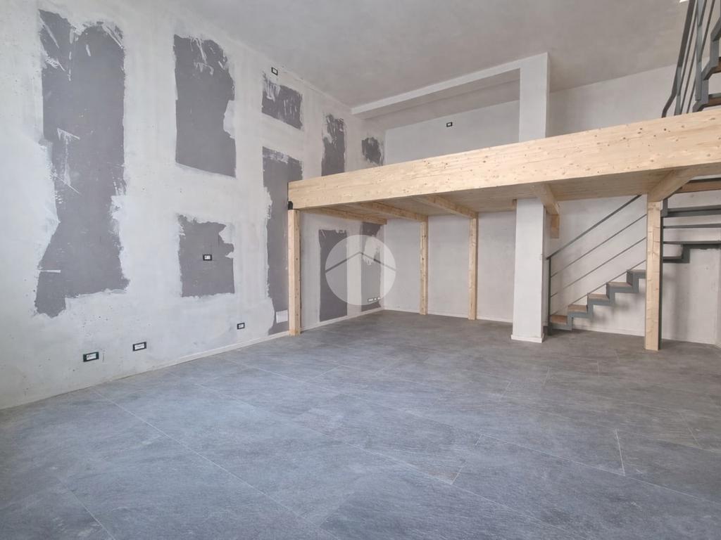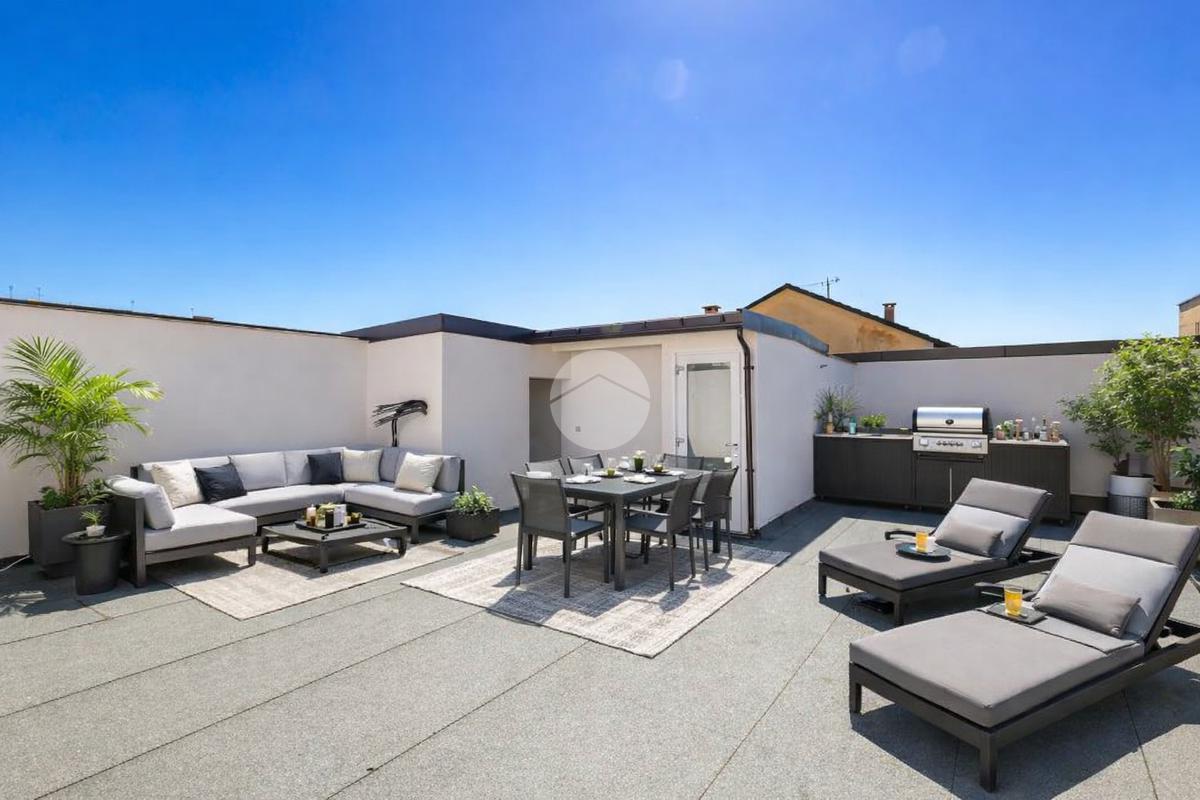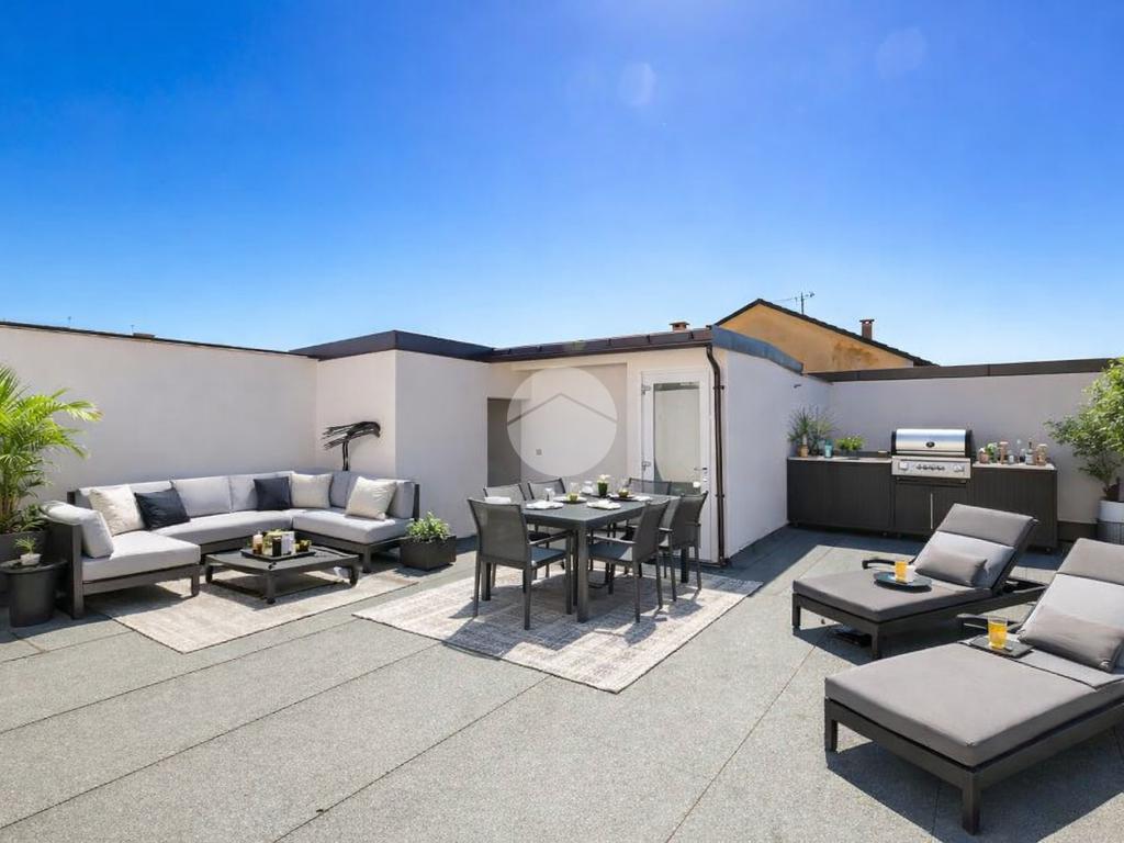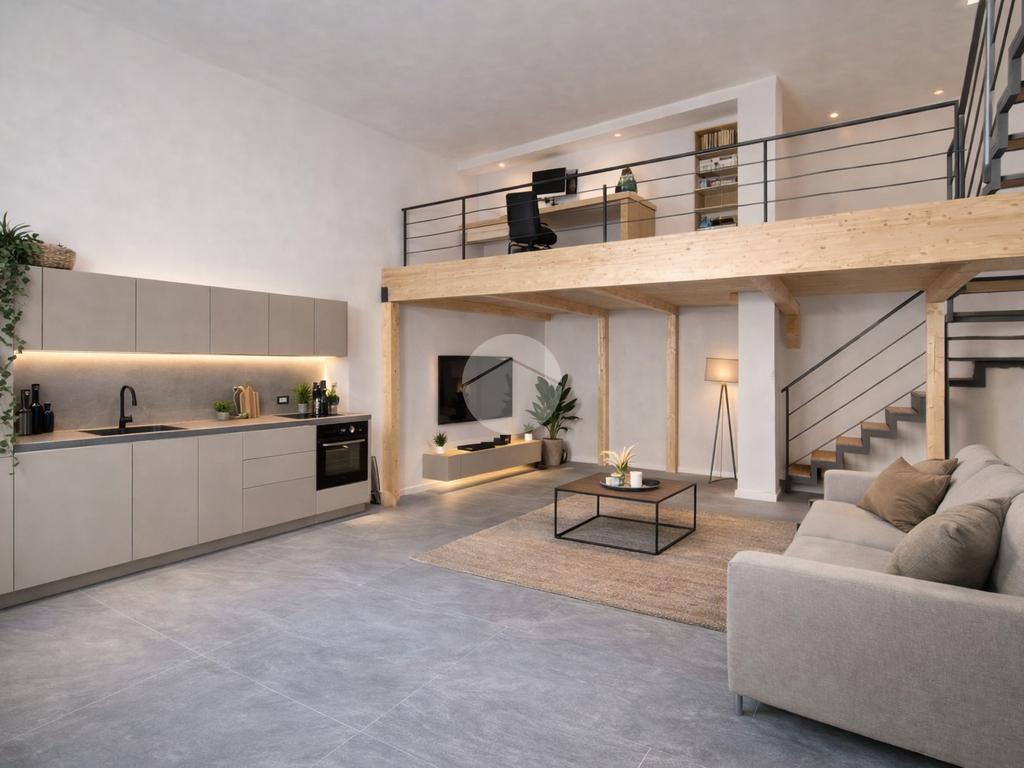 La scala posizionata nella zona giorno collega sia ad un soppalco d'arredo e sia al terrazzo di circa 65 mq dove è possibile posizionare degli arredi da esterno con ripostiglio adibito anche a locale tecnico.