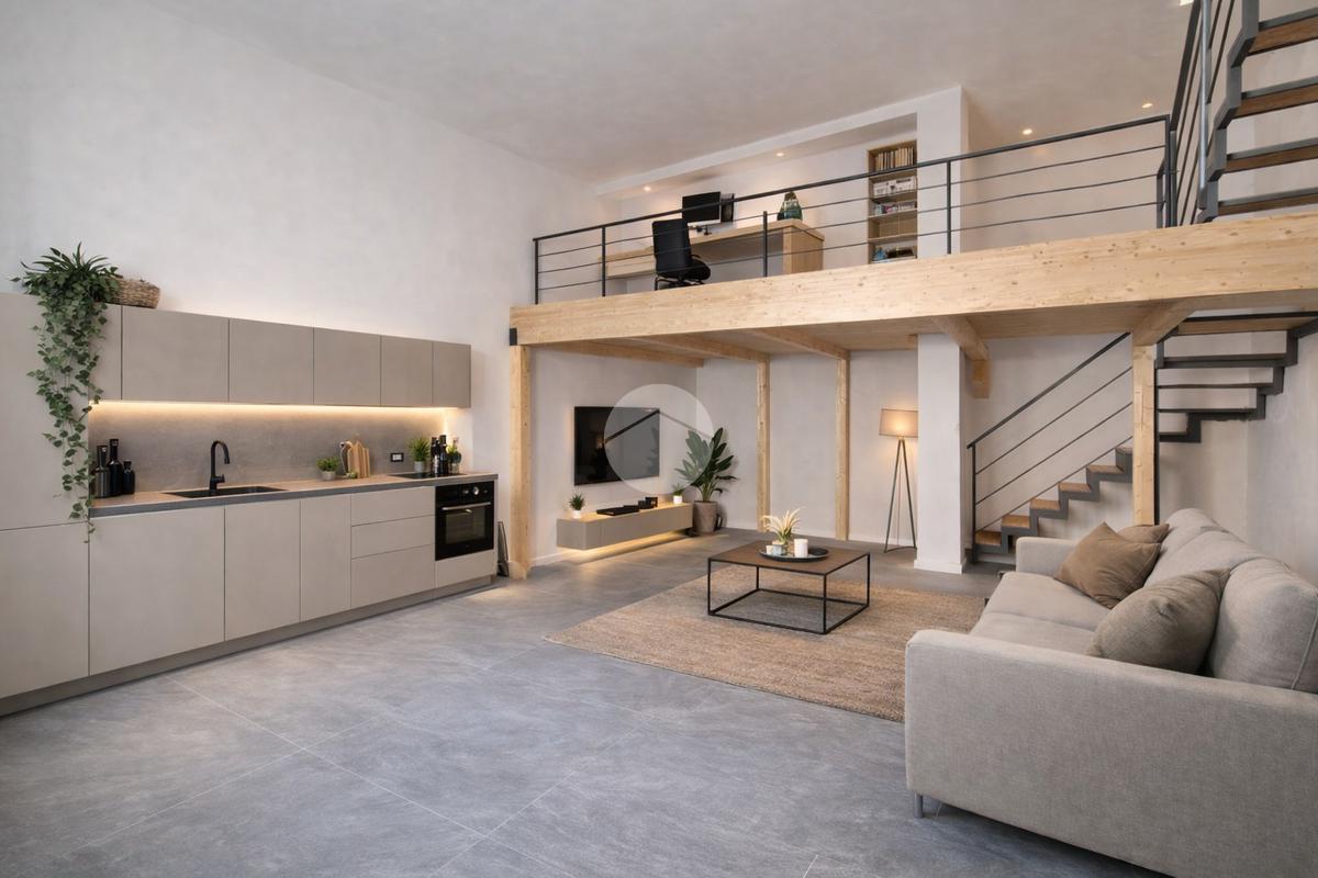 Il soppalco d'arredo a vista nella zona giorno offre numerose possibilità di allestimento: al piano inferiore un accogliente salotto con divano angolare e TV; al livello superiore un funzionale studio o area giochi.