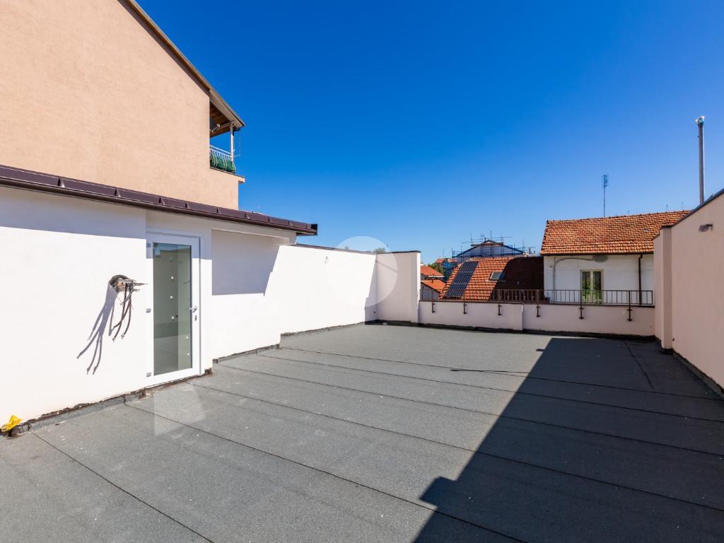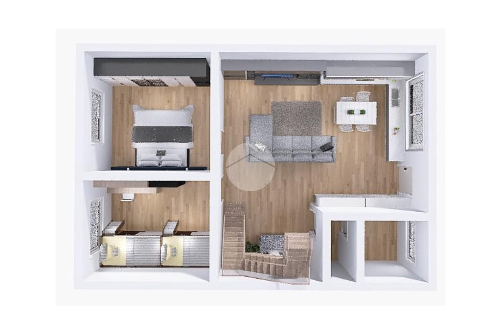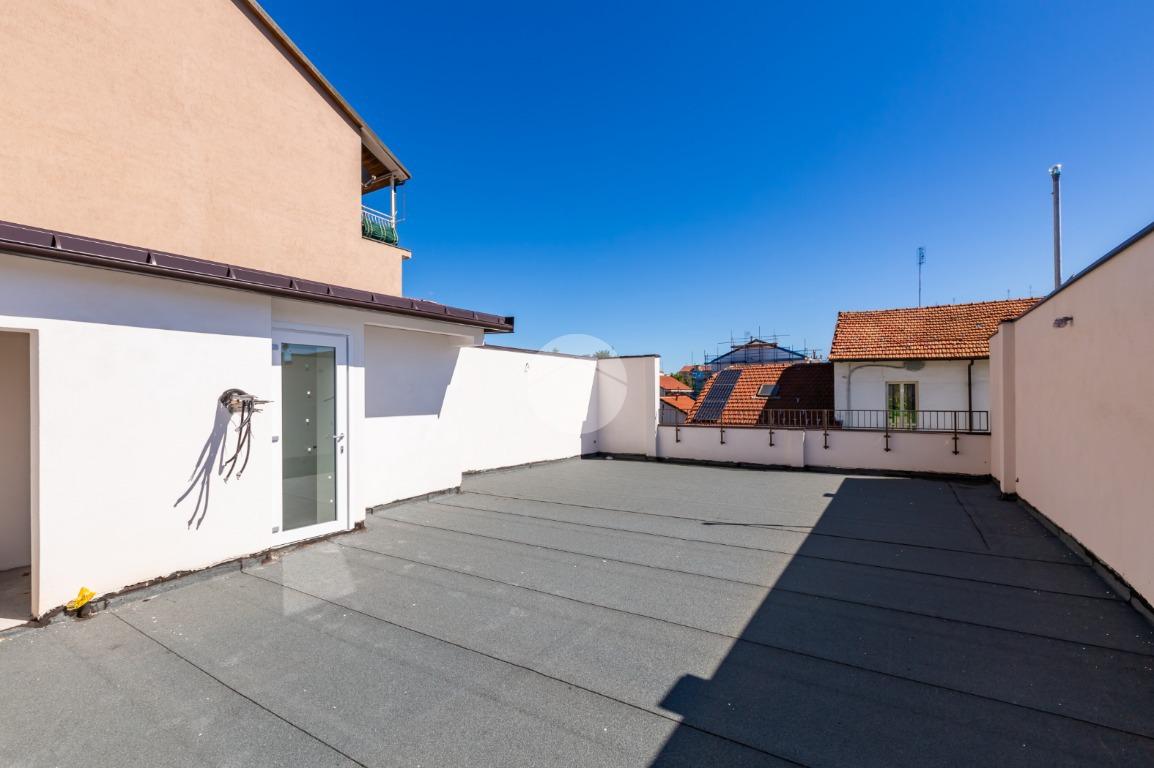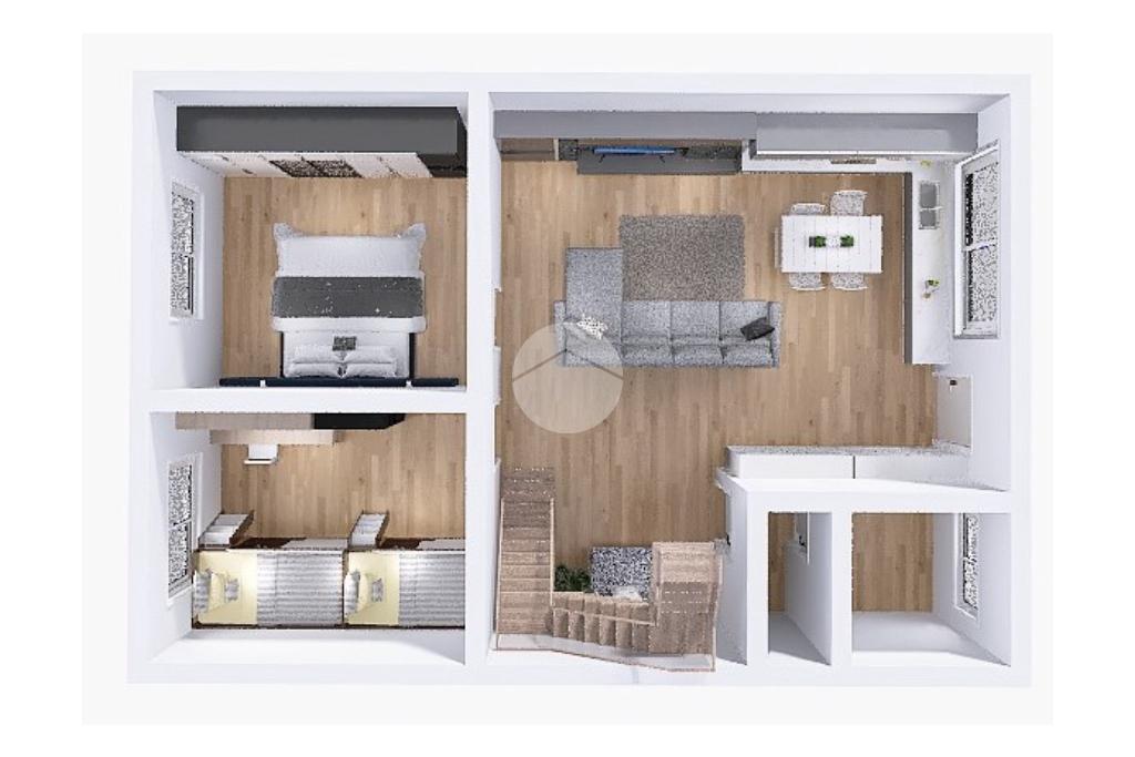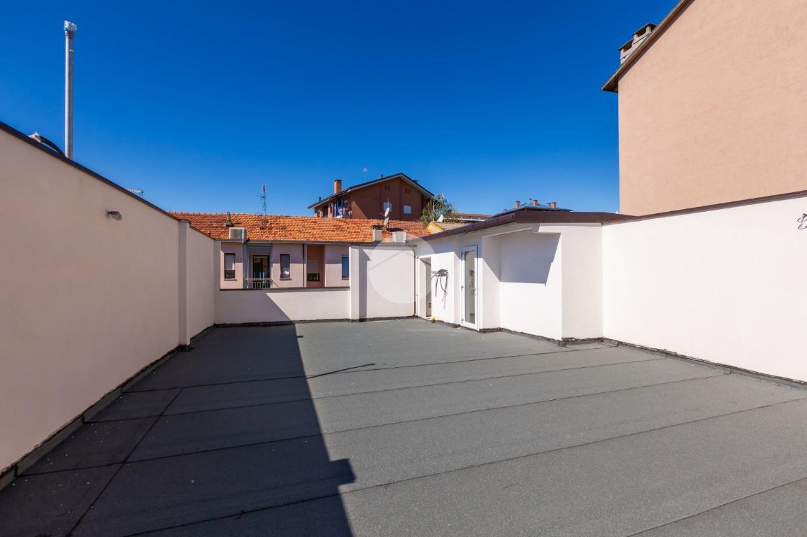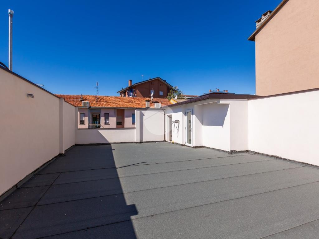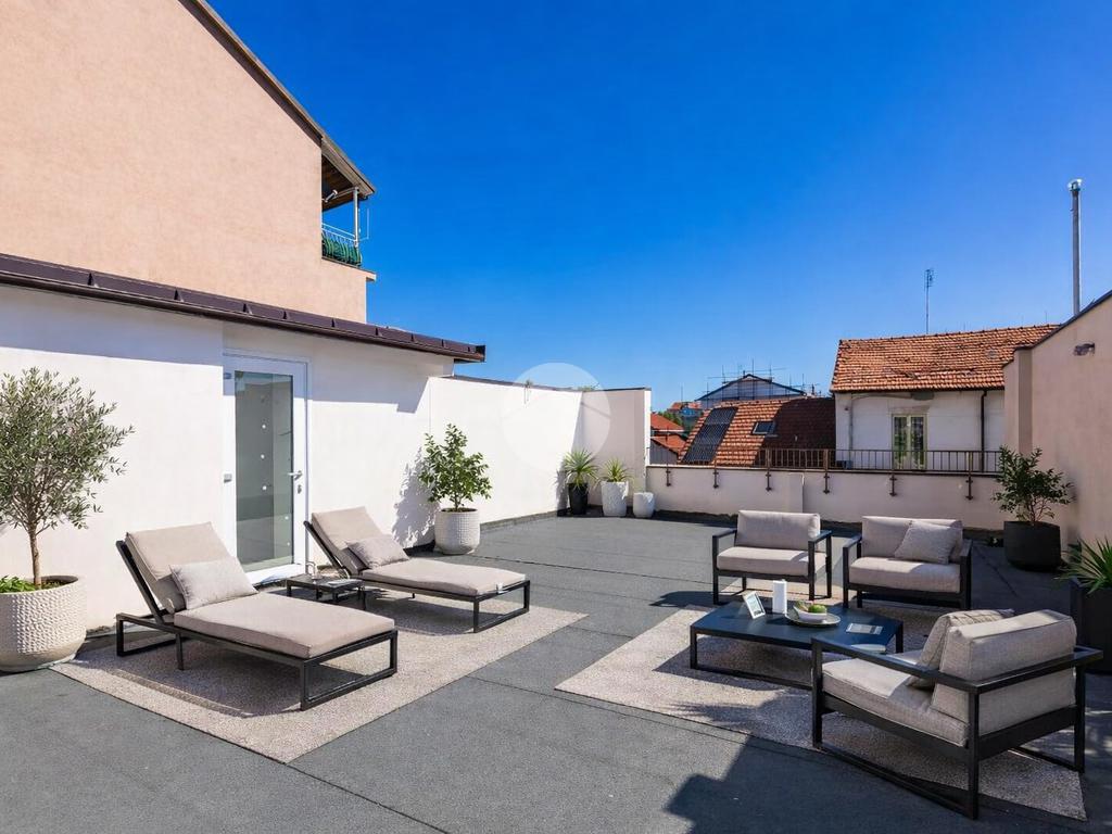 La scala posizionata nella zona giorno collega sia ad un soppalco d'arredo e sia al terrazzo di circa 90 mq dove è possibile posizionare degli arredi da esterno con ripostiglio adibito anche a locale tecnico.