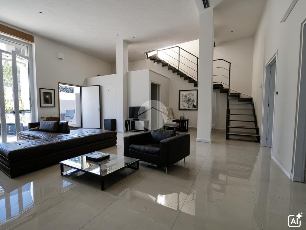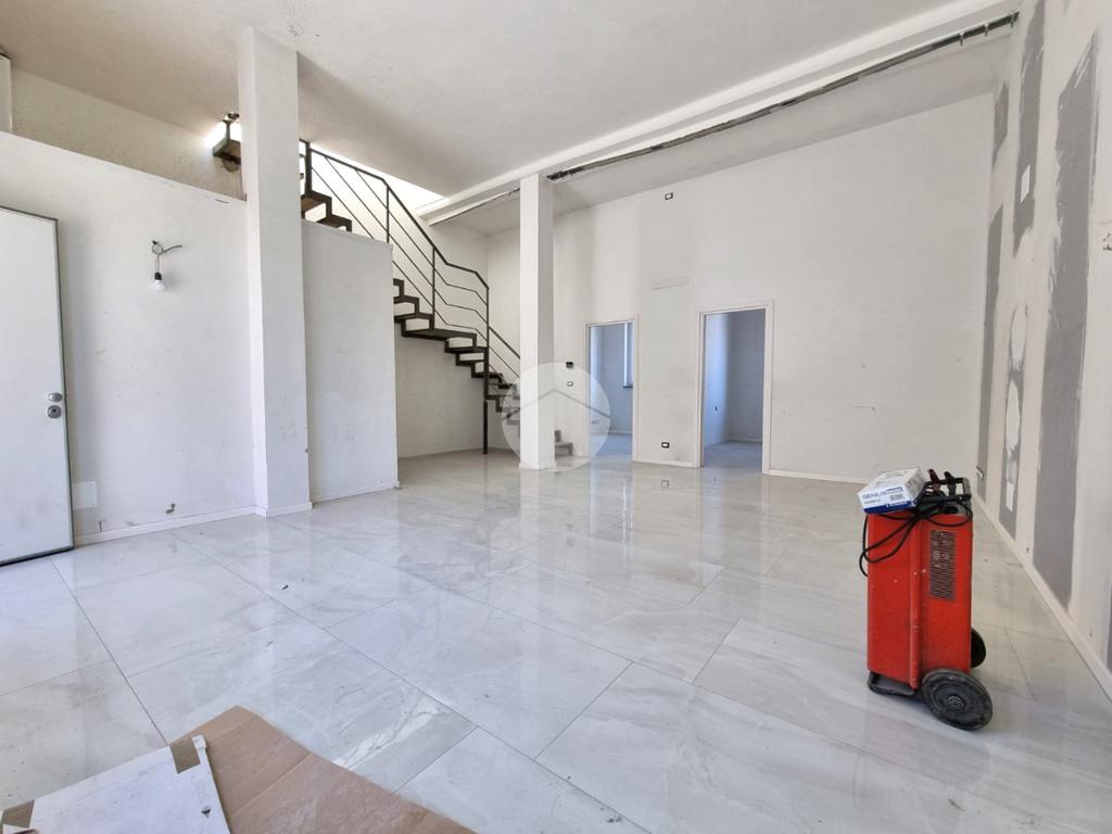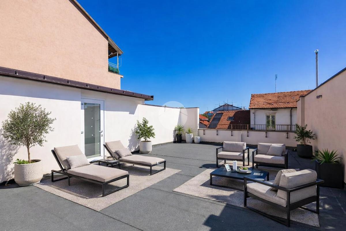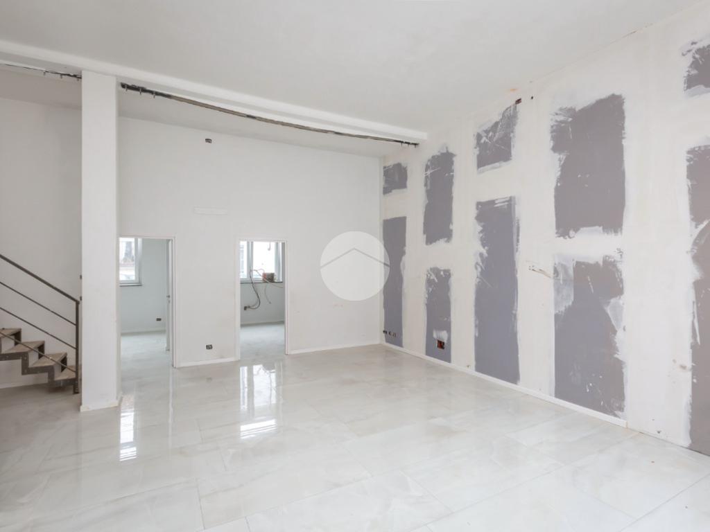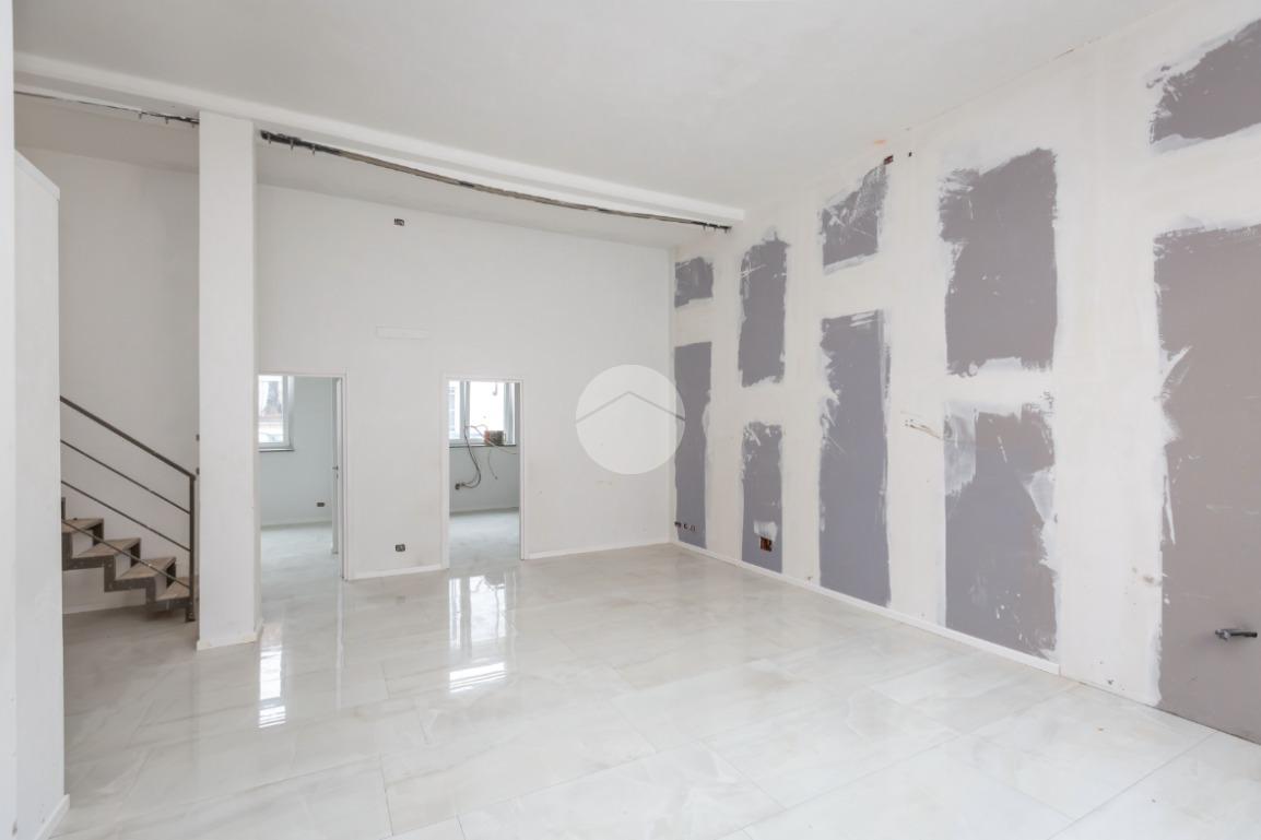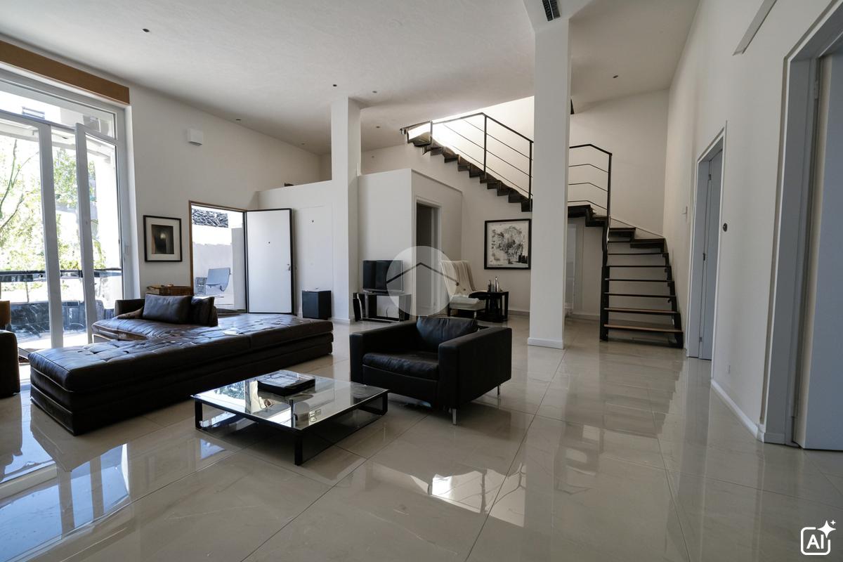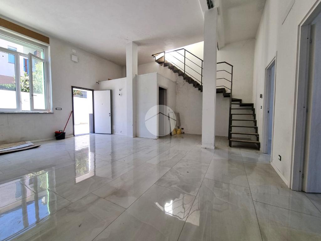 La scala posizionata nella zona giorno collega sia ad un soppalco d'arredo e sia al terrazzo di circa 90 mq dove è possibile posizionare degli arredi da esterno con ripostiglio adibito anche a locale tecnico.